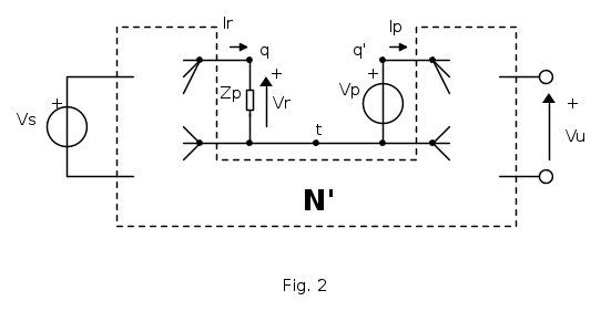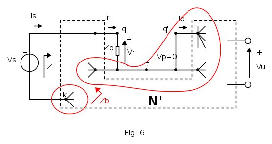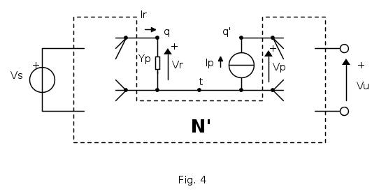 Colleghiamo un generatore di tensione di test VS e facciamo coincidere il nodo "q" con l'ingresso della rete e far poi confluire tutti gli altri rami -eccetto quindi il solo collegamento a VS- sul nodo "q' ".