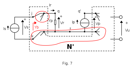 Rifacendosi alla rete originale N di Fig. 1 quando ci fosse più comodo è anche possibile eseguire il taglio in maniera duale: inserendo una ammettenza di prova YP ed un generatore di corrente IP come quì sotto in Fig. 4