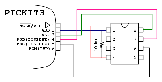 Sarà il PICkit3 ad alimentare il circuito; in alternativa bisognerebbe collegare il PIN 1 a VDD (il + dell'alimentatore o delle batterie) e al PIN 8 GND (il -).