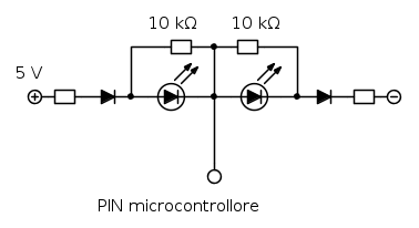 Le resistenze da 10 kΩ servono per polarizzare i diodi al silicio facendo passare un minimo di corrente e provocando 0,6 V di caduta, senza che quella stessa corrente debba attraversare i LED con l'effetto di illuminarli debolmente.