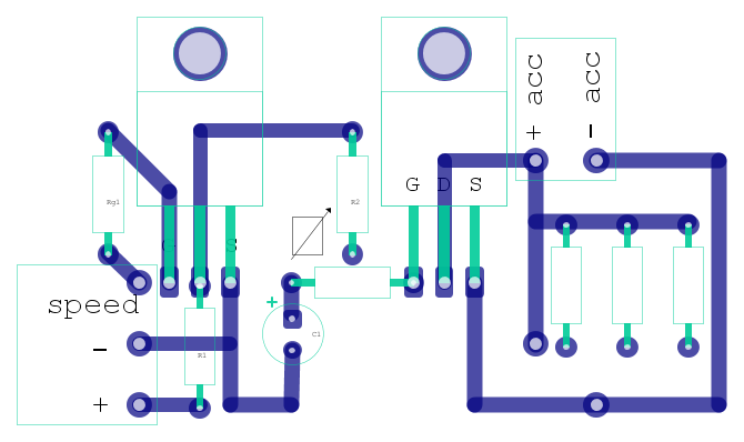 Invece non sono riuscito a sfruttare il segnale del tachimetro per attivare e disattivare il circuito. Visto che l'azione è molto fluida anche con Rs fissa (indipendente dalla velocità) e visto che avevo già accrocchiato su millefori il tutto, per non ricominciare (e per pigrizia) ho deciso di implementare semplicemente un ritardo all'accensione, in pratica per una 20ina di secondi il secondo FET è chiuso e l'auto può essere avviata; dopo va in conduzione il 1o FET, il 2o si apre e viene quindi ridotta la frenata rigenerativa: