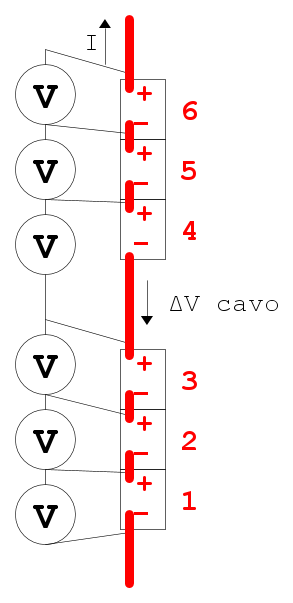 Spostando il punto di collegamento del cavetto del voltmetro la cella che include la tensione sul cavo diventa la n.3:
