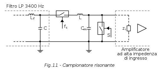 Prima di passare al blocco di quantizzazione, voglio annoverare un altro tipo di circuito campionatore che veniva utilizzato nelle centrali di commutazione, cioè quello basato sulla logica del campionamento di energia (o risonante) ed avente il seguente schema elettrico: