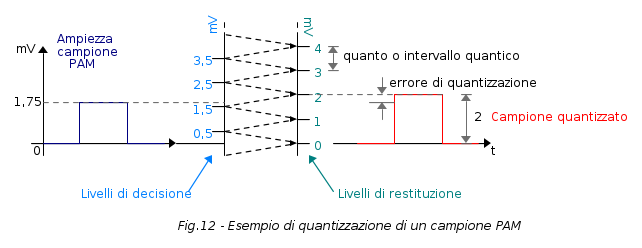Entrando un po' più nel contesto specifico, si può dire che quantizzare consiste nel paragonare i campioni PAM ad una scala di tensioni prefissate ed associare al campione il valore di tensione a cui esse più si avvicina. A tal proposito soffermiamo la nostra attenzione sulla seguente figura: