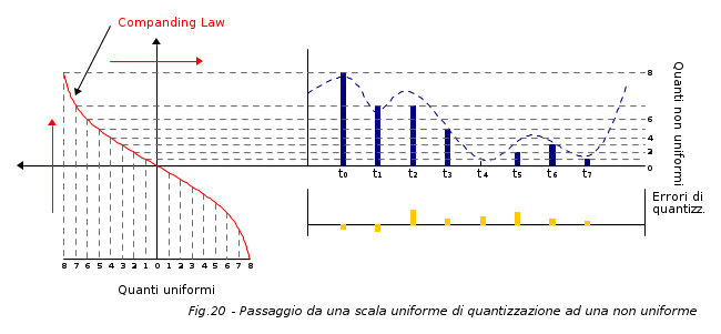 In sostanza si vuole arrivare al concetto di quantizzazione non lineare con la quale i gradini di quantizzazione non sono più uniformi ma via via si allargano all'aumentare dell'ampiezza del segnale; in tal modo si raggiunge il risultato di eguagliare praticamente il rapporto segnale/rumore in tutto l'arco della dinamica, dato che per segnali bassi sono interessati quanti ravvicinati e per segnali elevati quanti più distanziati, come si può vedere nella seguente figura: