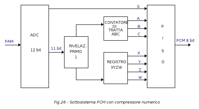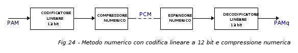 - metodo numerico che prevede una quantizzazione lineare, realizzata direttamente nella codifica del segnale PAM e con codice di uscite del tipo S ABX XYZW (noto come codifica autocompressa) e una quantizzazione lineare ad elevato numero di decisione (2 x 2048) con codificatore a 12 bit ed elaborazione numerica del segnale PCM mediante un compressore numerico.