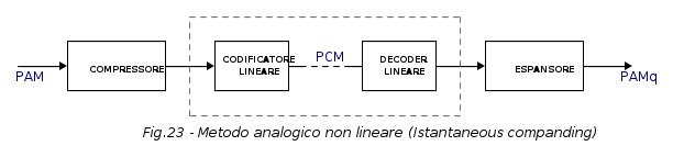 Nel metodo analogico il segnale PAM, prima di essere convertito in forma numerica, attraversa un compressore analogico. Tale dispositivo è, sostanzialmente, un amplificatore logaritmico che ha il compito di amplificare i livelli più bassi del segnale PAM e comprimere quelli alti. La caratteristica di trasferimento di tale circuito è esattamente quella relativa alla Companding Law precedentemente analizzata.