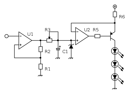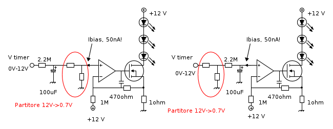 I 50nA tipici di corrente di bias che escono dagli ingressi del 358A devono passare per la resistenza da 2.2Mohm e fa una caduta di tensione di 110mV, una enormita` rispetto ai 700mV della dinamica che abbiamo. Inoltre questa corrente uscente terrebbe sempre accesi i led, perche' l'operazionale che e` miope vede 110mV sul suo ingresso, non sa che li ha generati lui, e accende i led con 110mA.