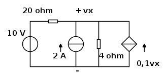 Dovrei fare 2 circuiti, perché il generatore dipendente resta inalterato...Spegnendo il generatore di corrente da 2A mi viene "v con x" 30V , spegnendo il generatore di tensione "v con x" viene 20V...ma il risultato dovrebbe essere 12,5V... Può gentilmente mostrarmi lo svolgimento dell'esercizio per chiarirmi le idee?..Ringrazio.