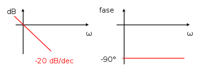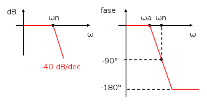 Fase: il diagramma asintotico della fase si ottiene collegando tra loro i due asintoti orizzontali (0° e -180°) tramite una retta passante per i punti