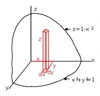 Come esempio di solido generato dalla rotazione di una linea attorno ad un asse possiamo assumere un paraboloide ricavato dalla rotazione attorno all'asse z della parabola z = 1 − x2, fra il vertice nel punto (0,0,1) e cerchio unitario sul piano xy (z=0). Il metodo "classico" di soluzione prevede una doppia integrazione in y ed x della funzione z = 1 − (x2 + y2), tenendo conto della dipendenza fra y e x. Il concetto è evidente da questa figura: