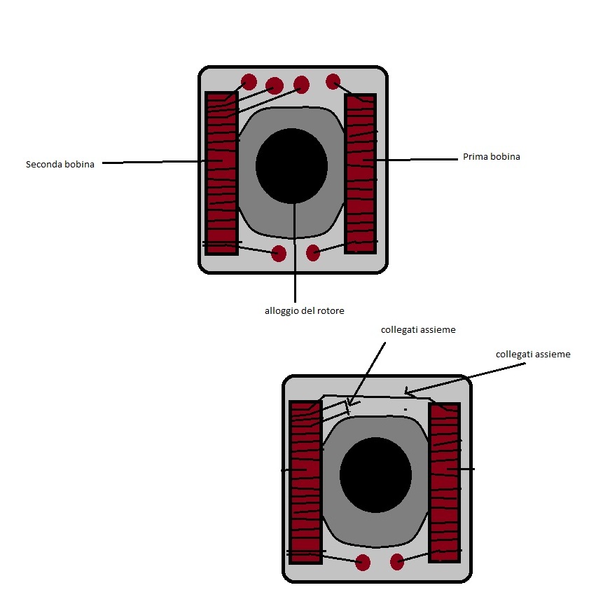 Alla fine abbiamo tolto il motore, senza condensatore o centralina, che idioti lo so... Arrivato a casa con il malloppo mi domandavo come farlo girare. Smontato l'involucro a prima vista mi appariva altro che un motore ad eccitazione indipendente ma proprio così semplice non è la cosa.. Da un lato infatti uscivano quattro zoccoli a cui erano collegati 4 fili di rame che provenivano dalle bobine e dal lato opposto 2 altrettanti zoccoli con il rame che proveniva sempre dalle bobine esterne che, a quanto ho capito, sostituiscono i magneti permanenti. A questo punto allego un immagine molto ma molto rudimentale su come si presentava il motore e poi come ho fatto collegamenti per trasformare il motore quindi in un motore ad eccitazione indipendente.