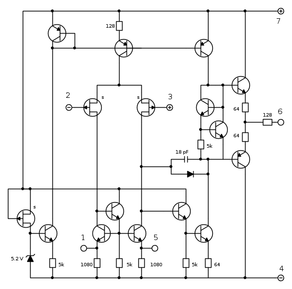 Ed eccoci finalmente a parlare del circuito in quanto tale. Il circuito è un esempio di altissima ingegneria... Il cui merito va però al progettista che progettò il TL071 quasi quarant'anni fa, non certo a noi! :-). Noi qui ci limitiamo a sfruttare con comodo una briciola della flessibilità d'uso consentita da questo operazionale. Qui sotto il suo schema interno: