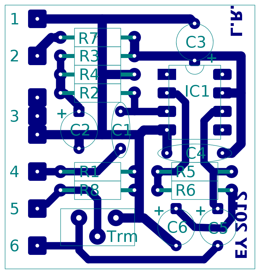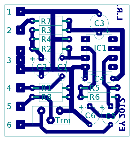 Successivamente si possono poi applicare le finiture utili. Alcuni testi chiari sono sempre utili per riconoscere il lato componenti ed il lato rame. Nel nostro progetto ho messo, sul lato rame, unico lato da incidere, le sigle "L.R." ed "EY2012". Infatti quando si sviluppa e si incide la piastra si ha solo un foglio di vetronite ramata in mano con il relativo lucido e non riconoscere l'esatto profilo delle piste e l'orientamento del lucido significa potenzialmente incidere una piastra "specchiata", poi inutile per qualunque scopo.