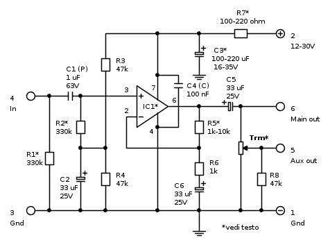 Nella stesura del testo è stato dimenticato di specificare il valore del trimmer di uscita (o all'occorrenza anche un potenziomentro vero e proprio) che infatti... se ne è rimasto solo soletto in "compagnia" dell'asterisco. In effetti per questo trimmer non esiste un valore "ottimale" in quanto questo va definito in base alle esigenze degli ingressi linea dei circuiti che vengono dopo questo pre; deve però essere rispettato un valore minimo sia per non sovraccaricare l'uscita dell'operazionale sia per evitare, nel caso lo si alimenti a 9 volt, un'ulteriore riduzione del già non proprio abbondante massimo valore di picco della tensione di uscita.