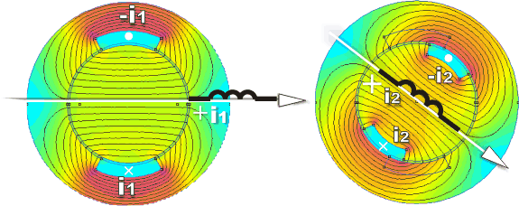 Nella figura seguente sono rappresentati i due avvolgimenti che agiscono contemporaneamente dando luogo al campo magnetico risultante di cui sono rappresentate le linee, e, a tratteggio l’asse.