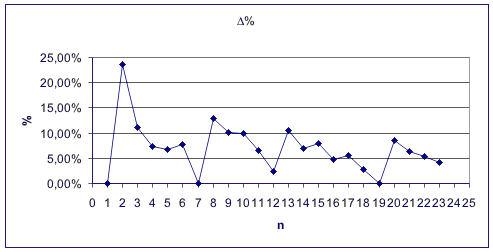 Dal confronto fra i due andamenti noto che la differenza tra i rapporti è sempre inferiore a 0,5 L’ultimo grafico, poi, è proprio simpatico: l’incidenza percentuale va a decrescere (anche se oscillando stranamente, come i clienti di Malvas dopo mezzanotte).