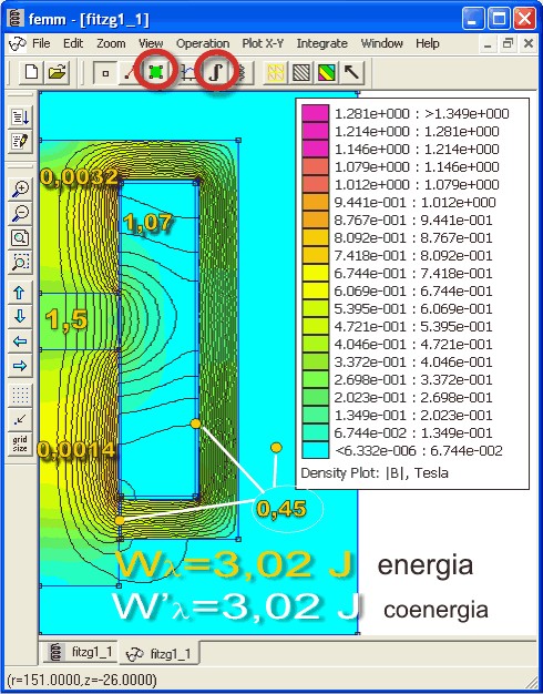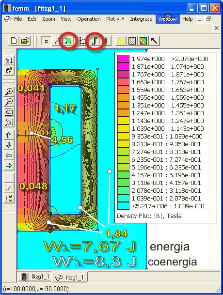 Quindi, dopo aver scelto il primo pulsante cerchiato, si clicca sulle sezioni dei volumi che interessano; esse si coloreranno di verde indicando di essere state selezionate. A questo punto cliccando sul secondo pulsante cerchiato, quello con il simbolo dell'integrale, appare una finestra in cui si sceglie quel che si desidera calcolare: energia magnetica, coenergia (ed anche molto altro). Nella figura sono mostrati i risultati delle energie per ogni volume ed i totali di energia e coenergia.