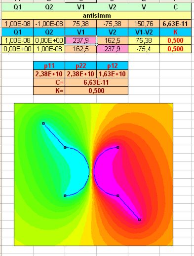- K = 0,5 indica armature simmetriche; la simmetria, quando l'induzione è completa, fa sì che le superfici equipotenziali che circondano un'armatura abbiano identica forma delle superfici equipotenziali che circondano l'altra.