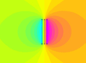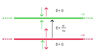 e considerarlo costante a qualsiasi distanza dalla superficie; le linee di forza saranno parallele e perpendicolari alla superficie stessa a questo punto introduciamo a due superfici, sempre infinite, cariche di segno opposto ad una distanza d, e notiamo come all'interno il campo raddoppi e all'esterno si annulli