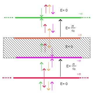 Introduciamo ora una lastra conduttrice, e notiamo come, gli elettroni vengano a muoversi verso il piano carico positivamente, in modo tale che il campo all'interno di un conduttore il campo elettrico risulti pari a zero;