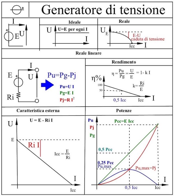Nella figura proposta sono mostrati il simbolo del generatore ideale, la schematizzazione di quello reale, le equazioni matematiche che interpretano quanto precedentemente descritto, i grafici cartesiani con tensione U in ordinata ed intensità di corrente in ascissa, detti caratteristiche esterne del generatore, che rappresentano le equazioni, l’andamento delle potenze generata, uscente e persa nel caso di un generatore lineare, il suo rendimento %
