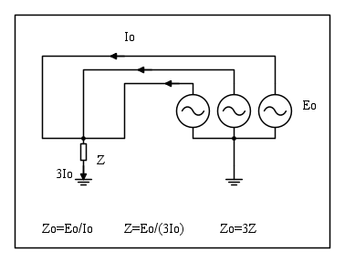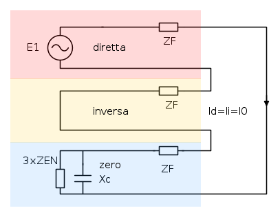 sia moltiplicato per tre nel bipolo di sequenza zero. L'impedenza di sequenza zero si ottiene imponendo nella sezione considerata tre generatori in fase, dopo aver annullato le fem di rete ed eseguendo il rapporto tra la fem del generatore imposto e la corrente di una fase. L'impedenza di messa a terra è percorsa da una corrente pari a tre volte quella di fase. La figura illustra quanto detto