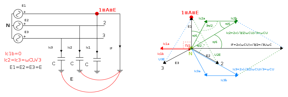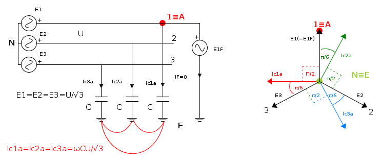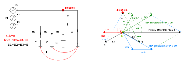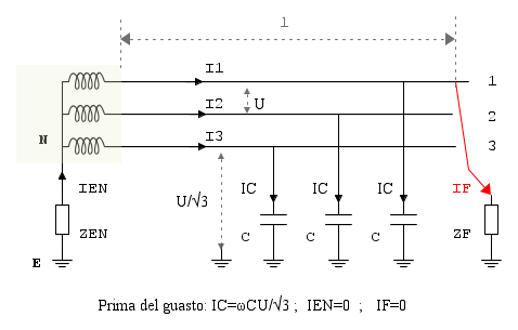 - Prima del guasto le correnti nelle tre capacità sono uguali in modulo e pari alla tensione stellata del sistema moltiplicata per la suscettanza verso terra :