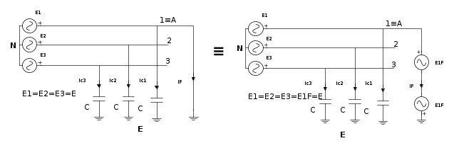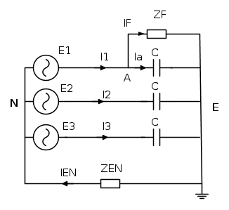![{{\dot U}_{EN}} = \frac{{\frac{{{\dot E_1}}}{{{{\dot Z}_F}}}}}{{\frac{1}{{{{\dot Z}_F}}} + {\text{j}}\frac{3}{{{X_C}}}}} = {{\dot E}_1}\frac{1}{{1 + {\text{j}}\frac{{3{{\dot Z}_F}}}{{{X_C}}}}} = \frac{{{{\dot E}_1}}}{{1 + {\text{j}}3\omega C{{\dot Z}_F}}} \quad [8]](/mediawiki/images/math/8/d/8/8d879ec348e9886a531ae9fbcbb7814c.png)