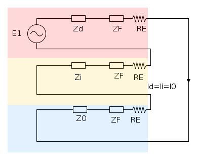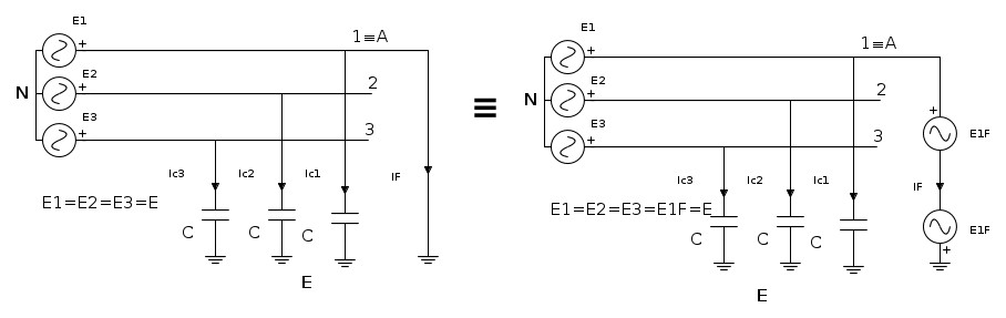 Si suppone che la terna delle tensioni sia simmetrica, quindi che non esistano tensioni di sequenza inversa e zero. Per l'ipotesi fatta di trascurare le impedenze longitudinali, il bipolo alla sequenza diretta è la serie della tensione di fase con l'impedenza di guasto; quello di sequenza inversa corrisponde alla sola impedenza di guasto; il bipolo di sequenza zero alla serie dell'impedenza di guasto con il parallelo della reattanza dovuta alla capacità rispetto a terra con il triplo dell'impedenza di messa a terra del neutro.