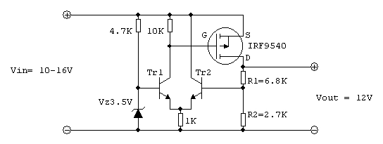R: Propongo uno stabilizzatore che fa uso di un mosfet P e per questo ha un dropout basso: il mosfet scelto, in saturazione ha una resistenza di 0.2 ohm tra drain e source e quindi se la tensione in ingresso è inferiore a circa 12.5V con 1.5A cadono solo 0.3V tra ingresso ed uscita, se la tensione in ingresso è superiore a 12.5V l'uscita è fissa a circa 12.2V.
