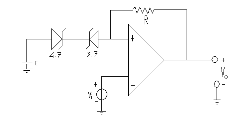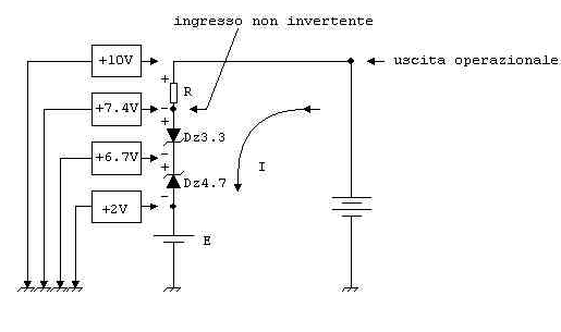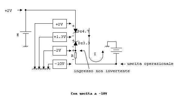 Nel tuo caso, se l'uscita dell'operazionale si trova a +10V rispetto a massa, si avrà, tramite la resistenza, uno scorrimento di corrente dall'uscita dell'operazionale all'anodo del secondo diodo (quello da 3.3V). Questa corrente attraverserà entrambi i diodi entrando nell'anodo del secondo che risulterà polarizzato direttamente (0.7V) e proseguendo nel catodo del primo che risulterà polarizzato inversamente (4.7V).