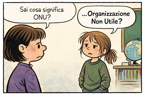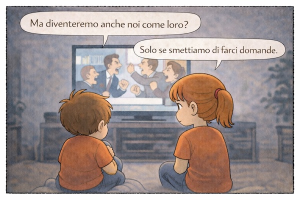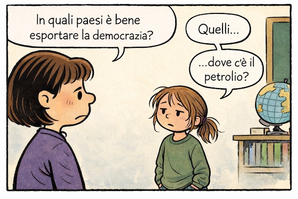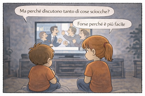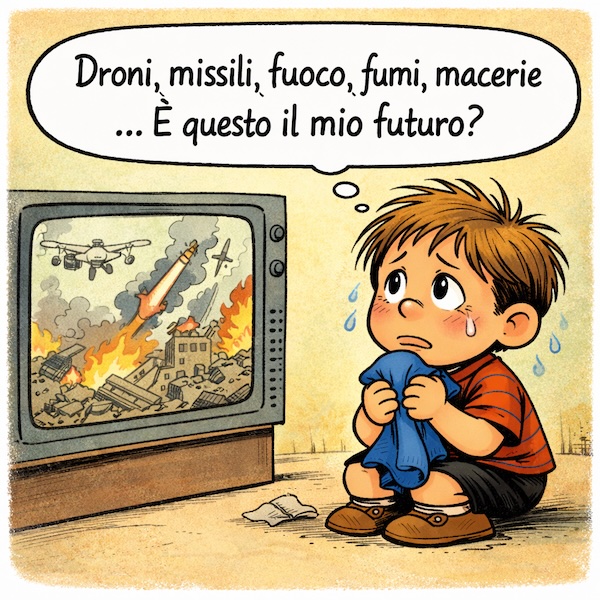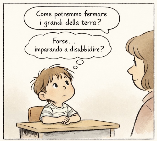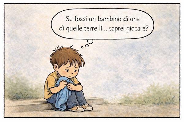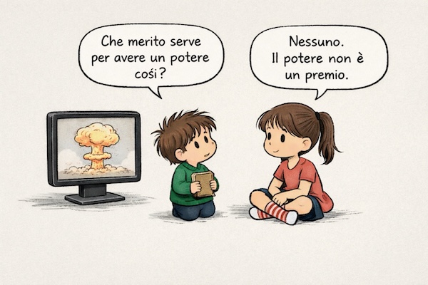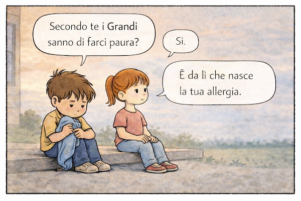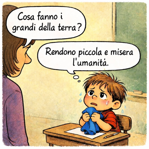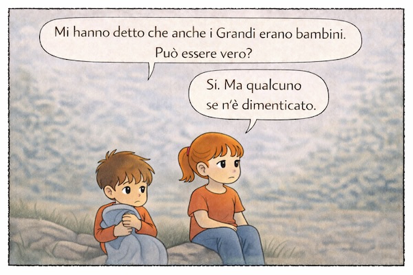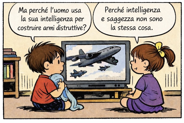 Quando succede qualcosa che non va – cosa non rara – e mi chiedo il perché senza riuscire a trovarlo, provo a condensare quel disagio in una vignetta: una riflessione affidata a un bambino, oppure a un breve dialogo fatto di una domanda e di una risposta.