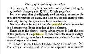 Una discussione di Elettrostatica mi ha portato a leggere quanto scriveva James Clerk Maxwell sui coefficienti di potenziale nel suo Trattato su elettricità e magnetismo un secolo e mezzo fa. Ho pensato di proporre la traduzione dei paragrafi relativi alla teoria dei sistemi di conduttori.