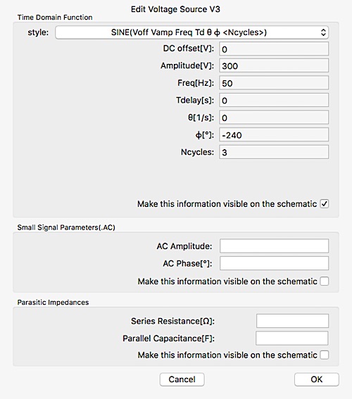 La tensione è sinusoidale, ha un'ampiezza di 300 V, la frequenza 50 Hz, la fase di -240°. Per gli altri due cambierà solo la fase: essendo il sistema simmetrico, 0 per il primo (V1), -120° per il secondo (V2). Sono anche indicati i periodi che saranno considerati nella simulazione. Ne abbiamo messi tre. Le informazioni saranno visibili o meno nello schema, a seconda che la casellina apposita sia spuntata o meno. Posizionando il cursore sulla scritta e cliccando con il destro compare la finestra per decidere se essa debba essere orizzontale o verticale