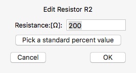 Nell'immagine precedente si vedono, accanto ai generatori ed ai resistori, alcune informazioni che ne definiscono le caratteristiche: nome e valore. Esse vanno inserite avvicinando il cursore a ciascun componente; comparirà una manina con il dito indice puntato sul componente. Ora, premendo il tasto destro del mouse, compare la finestra in cui definire le caratteristiche del generatore o del resistore.