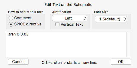 La finestra per scrivere la direttiva si attiva con il solito menù contestuale scegliendo draft/SPICE directive e quella che scriveremo potrà essere ad esempio .tran 0 0.02, ma anche semplicemente .tran 0.02. Il primo parametro della direttiva è Tstep che si può porre uguale a zero, il secondo è Tstop che è la durata del tempo di simulazione in secondi. Mettendo 0,02, cioè 20 ms analizziamo i dati di un periodo della tensione che ha frequenza 50 Hz.