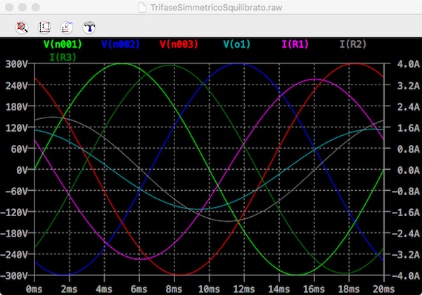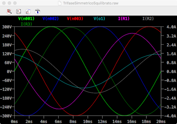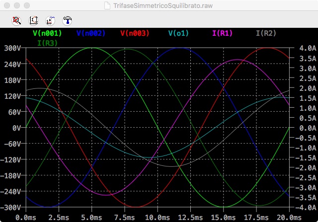 Dal grafico si può dedurre che il valore massimo della corrente I1 (IR1) è di 3,4 A cui corrisponde un valore efficace di 2,4 A, come trovato nel calcolo manuale. Tale corrente ritarda sulla tensione della prima fase di oltre mezzo periodo, oltre 11 ms, che corrispondono ai 201 gradi del calcolo manuale.