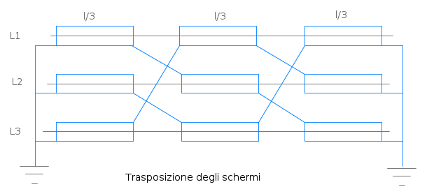 - Per ridurre le perdite, in linee lunghe si tagliano gli schermi e si incrociano i loro collegamenti in modo che in ognuno sia indotta una corrente dovuta alla somma delle correnti indotte delle tre fasi: se le correnti sono equilibrate, la corrente indotta nello schermo è nulla.