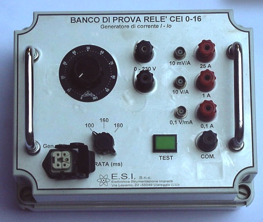 1) Unità banco prova relè 50 e 51N per iniezione di corrente I - I0 con regolazione continua di correnti 0 ÷ 25 A (coeff. di conversione 10 mV/A), 0 ÷ 1 A (coeff. di conversione 10 V/A), 0 ÷ 0,1 A (coeff. di conversione 0,10 mV/A) e tempi regolabili a scatti di 100 ms, 160 ms, 180 ms.