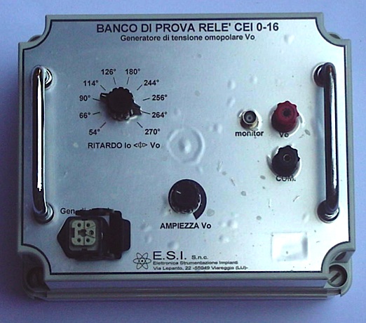 2) Unità banco prova relè 67N di generazione della tensione omopolare V0 nel campo di tensione 0 ÷ 8 VRMS (carico nominale Zc= 2 kΩ , Pn= 32 mV A) e sfasamento in anticipo su I 0 (o equivalentemente I0 in ritardo su V0) a scatti di 54°, 66°, 90°, 114°, 126°, 180°, 244°, 256°, 264°, 270°.