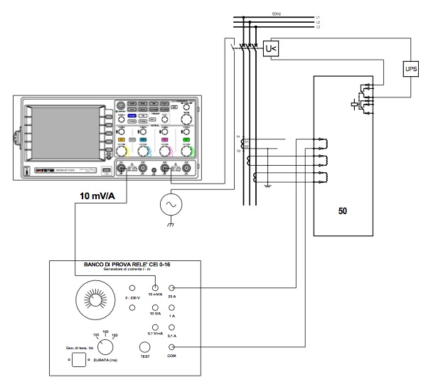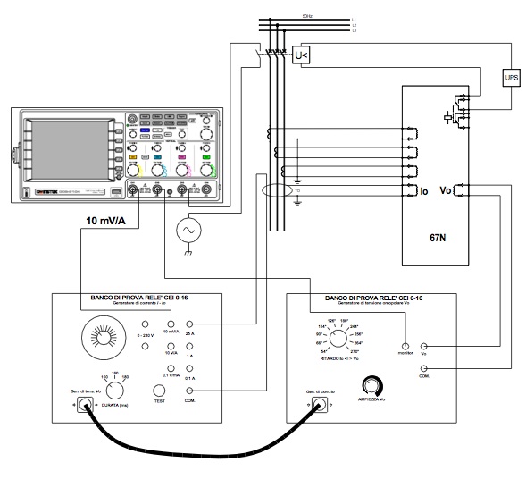 il banco prova relè applica una tensione omopolare all'ingresso voltmetrico ed inietta una corrente sul primario del trasformatore omopolare TO della protezione 67N con tempi e valori regolabili nel campo stabilito dalla tabella contenuta nella norma CEI 0-16 All. B.