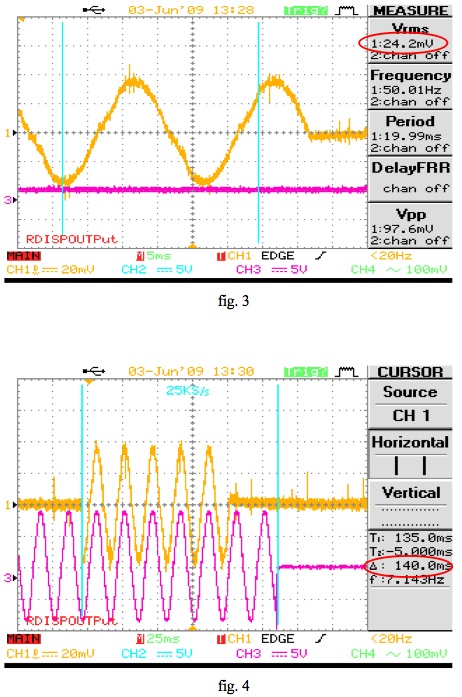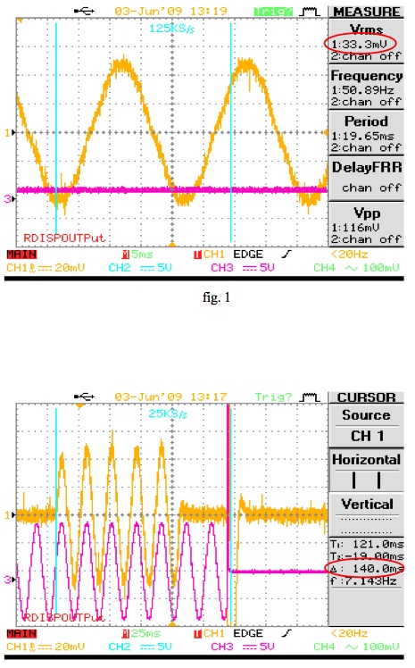 Un esempio di tali registrazioni è riportato di seguito : la fig. 1 si riferisce ad una corrente di prova pari a 3,33 A (33,3 mV letti con fattore di scala di 10 mV/A) che equivale allo scatto istantaneo della protezione regolata a 165 A primari (1,2 x 165/300 x 5 = 3,3 A); la fig. 2 evidenzia la corrente di prova applicata per 100 ms (5 sinusoidi da 20 ms ciascuna) all'ingresso amperometrico del relè ed il relativo tempo d'interruzione, evidenziato con i cursori di misura ∆t, inferiore ai 200 ms prescritti.