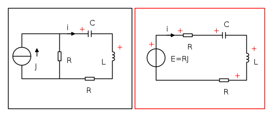 Sostituendo il generatore reale di corrente con l'equivalente di tensione si ottiene il circuito nel riquadro rosso.