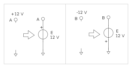 Nota Spesso, specie in elettronica per evitare eccessive linee, i circuiti vengono disegnati indicando il potenziali di nodi e terminali di rami che sembrano aperti. I punti suddetti sono il polo di un generatore ideale di tensione che ha l’altro polo collegato al riferimento, e f.e.m. pari al potenziale del punto. Quindi si hanno le seguenti corrispondenze