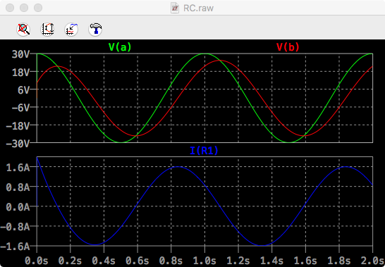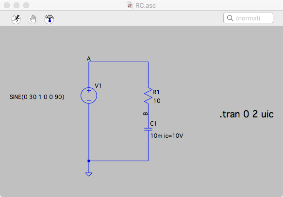 Version 4 SHEET 1 976 680 WIRE 464 144 224 144 WIRE 224 240 224 144 WIRE 464 240 464 144 WIRE 464 384 464 320 WIRE 224 544 224 320 WIRE 464 544 464 448 WIRE 464 544 224 544 WIRE 224 592 224 544 FLAG 224 592 0 SYMBOL voltage 224 224 R0 WINDOW 3 -319 61 Left 2 SYMATTR InstName V1 SYMATTR Value SINE(0 30 1 0 0 90) SYMBOL res 448 224 R0 SYMATTR InstName R1 SYMATTR Value 10 SYMBOL cap 448 384 R0 SYMATTR InstName C1 SYMATTR Value 10m ic=10V TEXT 752 352 Left 4 !.tran 0 2 uic