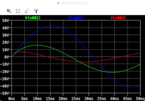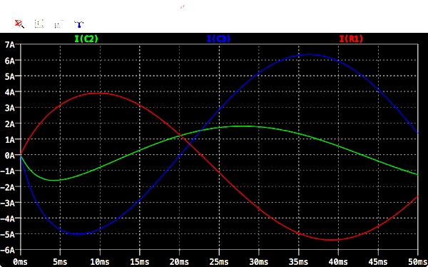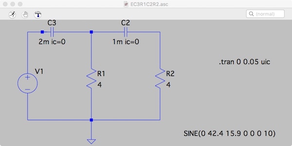 Version 4 SHEET 1 920 680 WIRE -16 208 -64 208 WIRE 0 208 -16 208 WIRE 144 208 48 208 WIRE 224 208 144 208 WIRE 368 208 288 208 WIRE 144 320 144 208 WIRE 368 320 368 208 WIRE -64 336 -64 208 WIRE -64 496 -64 416 WIRE 144 496 144 400 WIRE 144 496 -64 496 WIRE 368 496 368 400 WIRE 368 496 144 496 WIRE 144 560 144 496 FLAG 144 560 0 SYMBOL res 128 304 R0 SYMATTR InstName R1 SYMATTR Value 4 SYMBOL res 352 304 R0 SYMATTR InstName R2 SYMATTR Value 4 SYMBOL cap 48 192 R90 WINDOW 0 0 32 VBottom 2 WINDOW 3 32 32 VTop 2 SYMATTR InstName C3 SYMATTR Value 2m ic=0 SYMBOL cap 288 192 R90 WINDOW 0 0 32 VBottom 2 WINDOW 3 32 32 VTop 2 SYMATTR InstName C2 SYMATTR Value 1m ic=0 SYMBOL voltage -64 320 R0 WINDOW 3 509 219 Left 2 SYMATTR Value SINE(0 42.4 15.9 0 0 0 10) SYMATTR InstName V1 TEXT 560 304 Left 2 !.tran 0 0.05 uic