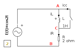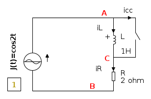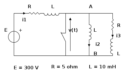 - Nel seguente circuito, avviene l'inverso: inizialmente l'induttanza centrale è cortocircuitata ed il circuito è a regime in quelle condizioni. Dobbiamo ipotizzare che la corrente sia nulla perché, teoricamente, potrebbe anche esserci, qualsiasi corrente continua, che circola nell'induttanza stessa e nel cortocircuito, a seconda di come si è arrivati nella condizioni di circuito chiuso.