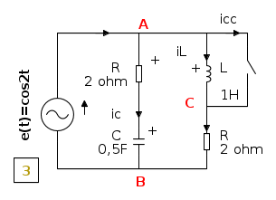 Per quel che riguarda il ramo di destra tutto avviene come nel precedente esercizio e, nel ramo centrale, non si ha alcuna variazione: il regime sinusoidale per t>0 è identico a quello per t<0.