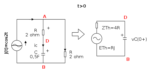 All'istante t=0 l'induttanza è cortocircuitata e in pratica "scompare" dal circuito da considerare per t>0. Si può ricavare il generatore equivalente visto dai terminali del condensatore per trovare l'andamento della tensione su di esso, tenendo presente che all'istante t=0 il condensatore è carico alla tensione vC(0 − )